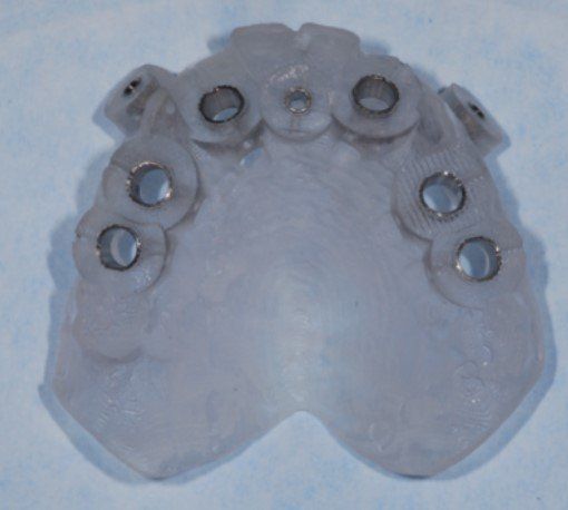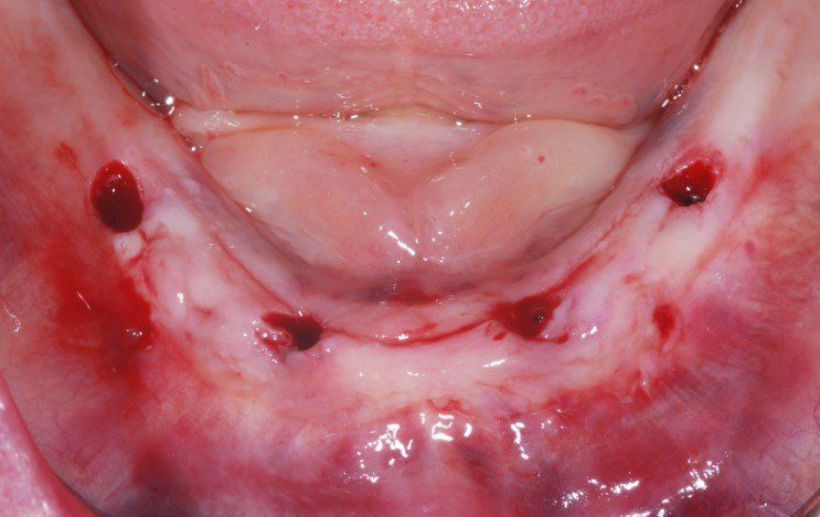 Il risultato alla fine della chirurgia di implantologia dentale è quello che si evidenzia nella foto: nessuna ferita ampia, nessun punto di sutura, inserimento ideale degli impianti secondo la guida del computer, spesso effettuato immediatamente.