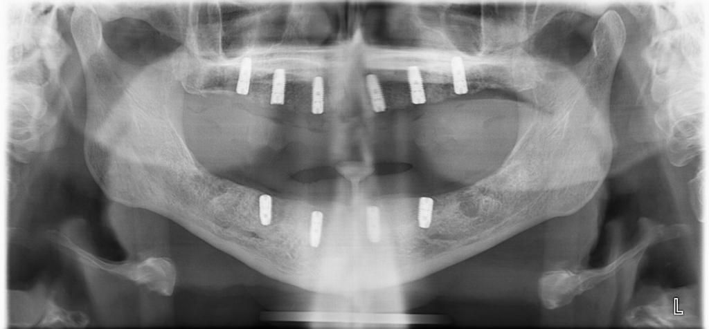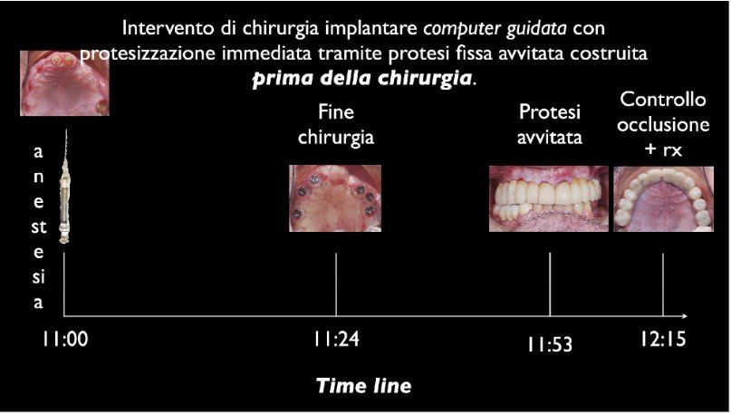 Il paziente nella foto, come si può vedere seguendo la linea del tempo è passato da una situazione di mancanza di denti all’inserimento degli impianti e alla protesizzazione del mascellare superiore in un’ora e 15 minuti. Ciò può essere fatto combinando le tecniche della chirurgia guidata e del carico immediato, qualora le condizioni siano idonee.